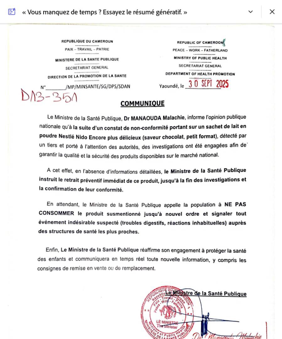 Dans un communiqué officiel daté du 30 septembre 2025, le Ministre informe l'opinion publique nationale qu'un constat de non-conformité a été signalé par un tiers concernant le lait en poudre Nestlé Nido Encore plus délicieux, dans sa version saveur chocolat et en petit format.